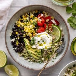 • To assemble the bowls, divide the rice and quinoa between 2 bowls. Drizzle with a little vinaigrette and toss. Divide the beans, avocado tomatoes, corn and feta between the bowls. Sprinkle each with a pinch of salt and pepper. Top with the fresh cilantro and sour cream. Drizzle on the remaining dressing and serve with lime wedges.