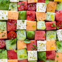 In the past, I also made this melon mozzarella salad with watermelon and cucumber. I love using the cucumber instead of the honeydew. It’s unexpected, a little more savory and refreshing and adds a pop of freshness without the sweet.
