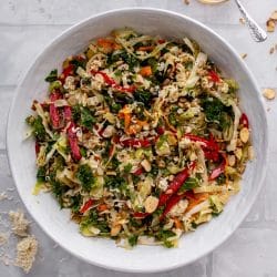 • In a large bowl, combine the cabbage, kale, peppers, carrots, green onions, almonds and sunflower seeds. Break apart the ramen noodles and add them into the bowl. Toss everything together.
