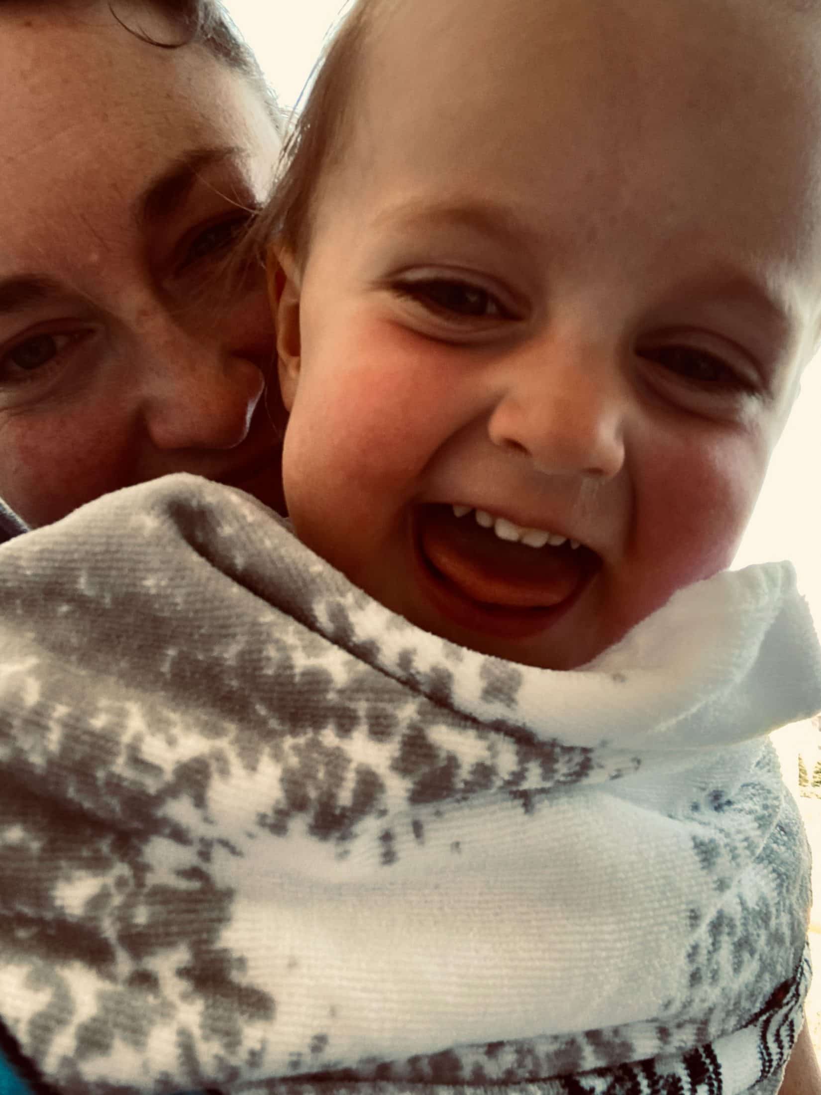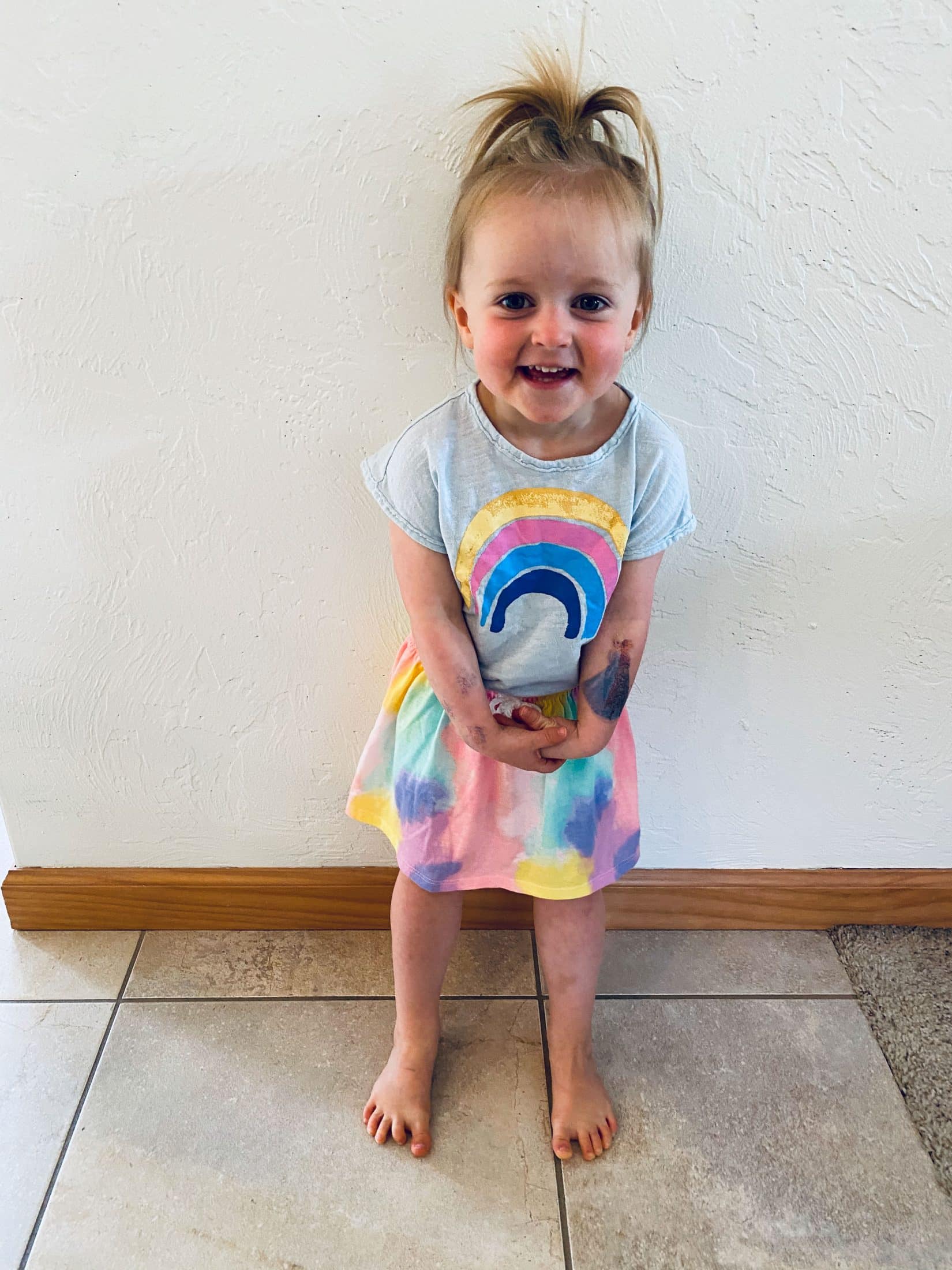 Oranges in her teeth and ready for a bath after playing outside. My heart!