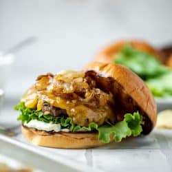 These caramelized onion burgers are loaded with flavor, smothered with cheese and caramelized onions and topped with garlic herb aioli.