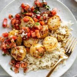 - Serve the scallops topped with the watermelon salsa. I love to serve these with jasmine rice too. However, if you’re having a dinner party or making them as an appetizer, they are great on their own with the salsa. As a great accompaniment to surf and turf!