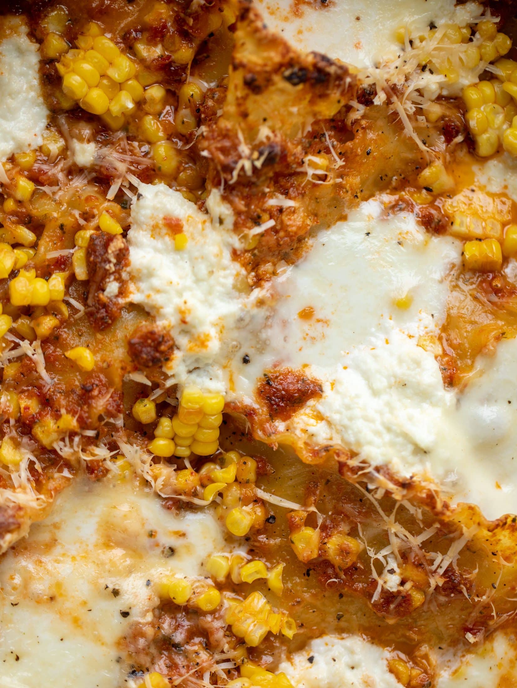 This skillet lasagna is loaded with a sun dried tomato pesto, sweet corn right off the cob, tons of ricotta, mozzarella and parmesan. Delicious.