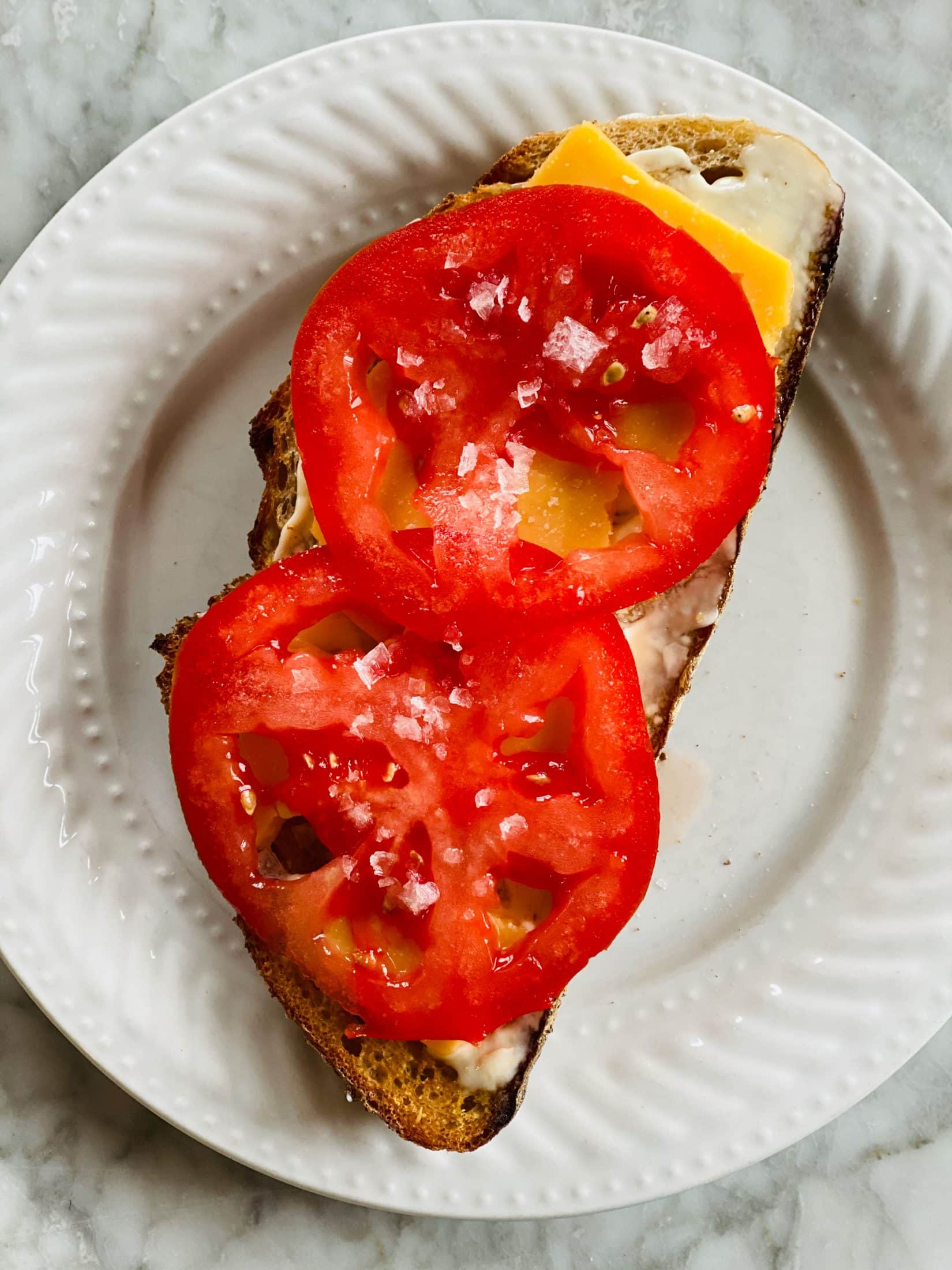 A perfect summer lunch! Sourdough, mayo, cheddar, tomato, flaked salt.