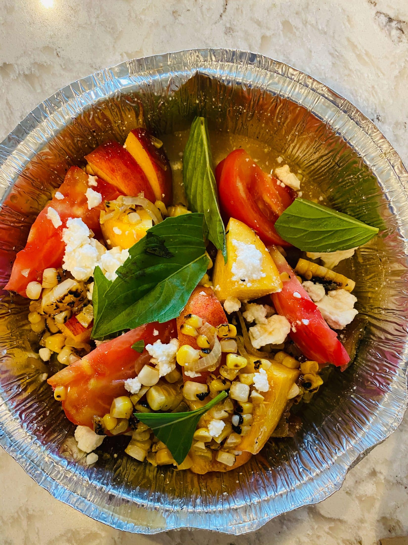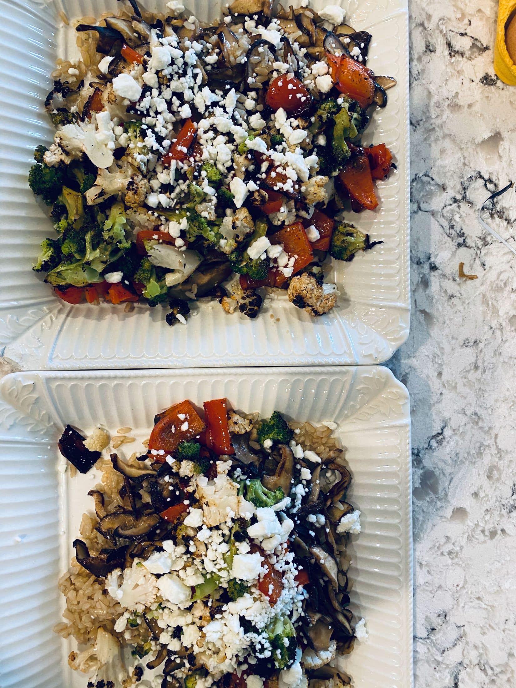 Here’s a quick meal I threw together for Eddie and myself. Grilled a bunch of veggies, mixed with brown rice, lots of toasted sesame oil and soy, a little feta.
