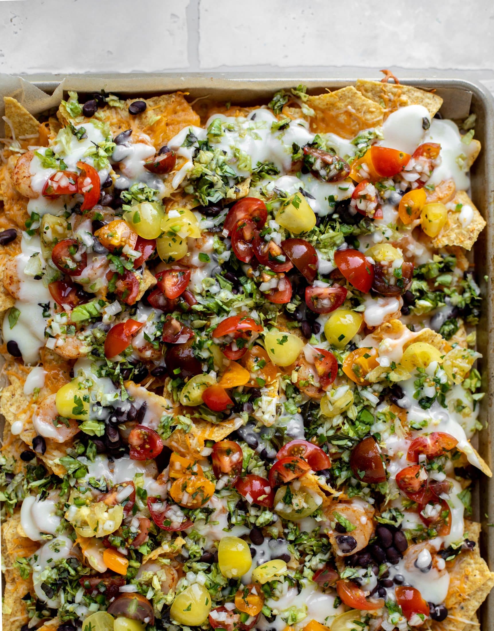 I might dub this summer the summer of the sheet pan nacho for us. Mostly because I have made some incredible combinations for a few small get togethers we’ve had at our house with family… and the nachos have been the first to go. Even some of our family members who don’t eat snacks? They DEVOURED them.