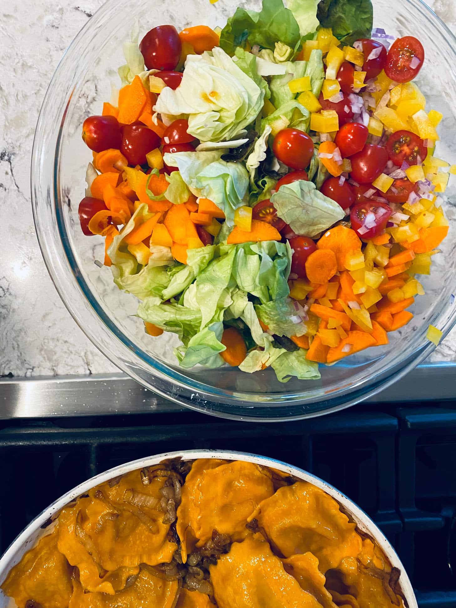 Last night I made caramelized onion and butternut ravioli with broccoli and a house salad. It was so good!