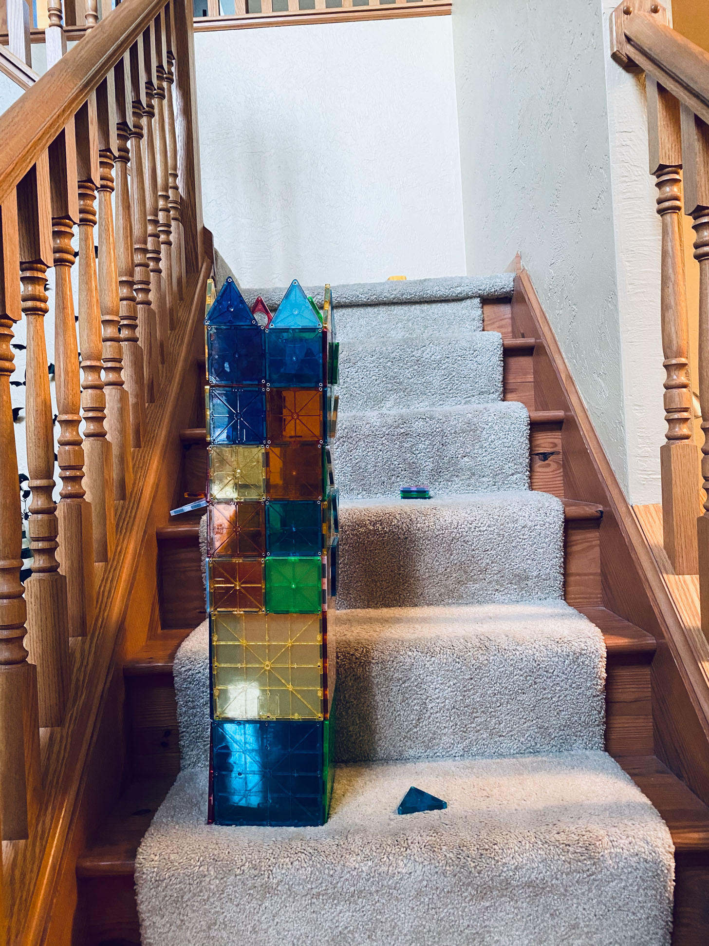 Emilia is obsessed with magnatiles right now. Max loved them for years and now they are her favorite thing. Side note: why are kids so obsessed with building and playing on the stairs?!