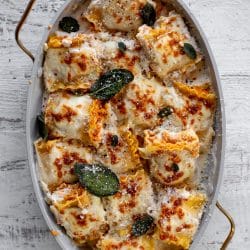 The pumpkin filling is loaded with ricotta and parmesan and sage. The béchamel sauce is creamy and classic with hints of nutmeg. Everything gets topped with cheese which takes it over the top, then crisp delicate sage leaves add that wonderful savoriness. I adore this.