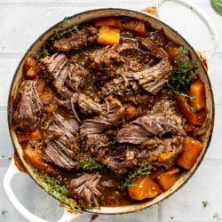My mom makes the BEST pot roast – it’s easily one of my favorite meals that she makes. She cooks hers in a Dutch oven on the stovetop, but I prefer using the oven because it’s more hands off. While the pot roast does take a few hours to cook, it’s passive time! You can get things done around the house or heck, read a book while it’s in the oven.