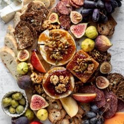 For the actual board, I like to use two creamier cheeses, like a brie and a creamy goat. I also absolutely love this caramelized cheese – it’s incredible and so warming for fall. However! The wonderful part of this board (or really, any board) is that you can use whatever cheese you like. If you’d rather use a hard cheese (hello drunken goat!), that works too. As long as you love the cheese and enjoy a savory + sweet combo, it will work.