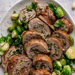 parmesan pistachio stuffed pork tenderloin with brussels sprouts
