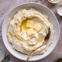 Don’t overmash or overwhip! If you aren’t a seasoned cook in the kitchen, I highly suggest mashing a bit with a potato masher first. Or using a ricer if you have one. Then if you want things super smooth, use a hand mixer – gently!. You have more control with the hand mixer than a stand mixer. With that being said, I do occasionally use my stand mixer because I know exactly how much I can whip without making gluey potatoes. I only ever use the electric mixers if I’m making a big batch on Thanksgiving.