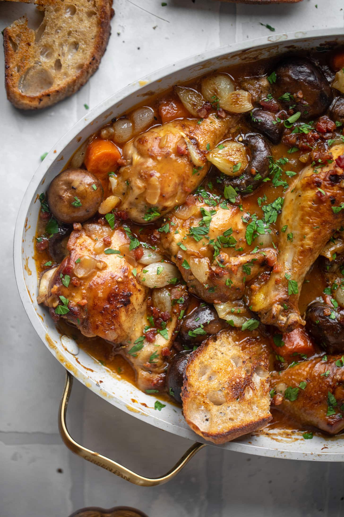 Traditional coq au vin has you marinate chicken in wine, and then you cook that marinade down into the most delicious gravy-like sauce. The whole dish also starts with bacon, which adds another layer of flavor.