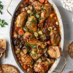 While beef bourguignon is a meal I’ve made a million times, coq au vin was more off the radar. I don’t know why! It just wasn’t something I was ever drawn to for us, and I would often make the more decadent beef stew or something like that.