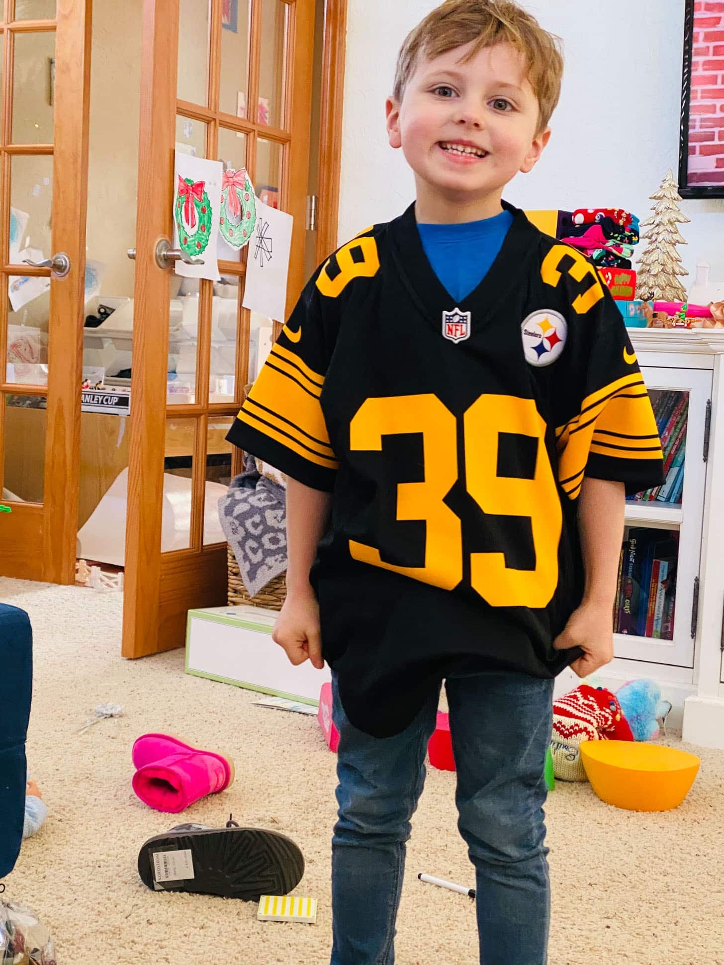 Max got a steelers jersey that he was VERY pumped about. See also: our floor has looked like this for three days. I CAN’T GET IT CLEAN!