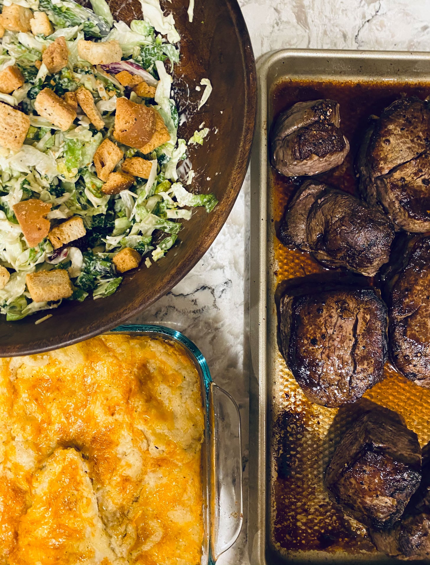 On christmas eve, I made filets, caesar salad, almond green beans and my mom made twice baked potatoes. It was so good.