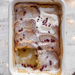 • Bake the french toast uncovered for 35 to 40 minutes, until puffed and lightly browned on top. Sprinkle with powdered sugar. Serve with the bourbon whipped cream, pomegranate arils and syrup for topping.