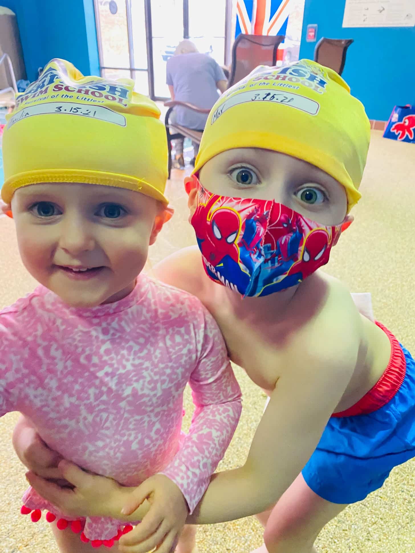 The kids also are doing swim lessons and they got swim caps! Too cute.