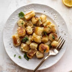 If you like toasted gnocchi (I’ve always LOVED it, I first made some back 2013!), you’ll love it. The very light sauce is just perfect to hold the crisped texture of the gnocchi. It tastes like heaven! Serve it as a side dish for the family, or have a bowl of it for dinner. All to yourself.