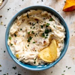 I love how creamy this dip is. My original french onion dip uses cream cheese and it’s definitely a thicker consistency. It also uses a bunch of onions, but more goes into it and the dip isn’t as silky or thin. It’s almost tricky to dip a thin chip into my original french onion dip.