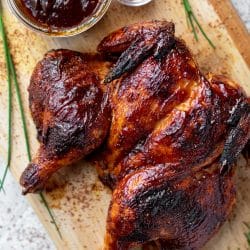 This whole grilled spatchcock chicken is smothered in a homemade spice mixture and cola BBQ sauce. It’s smoky, sweet, savory and juicy! Perfect summer meal straight off the grill.