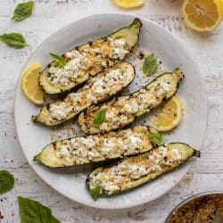 These grilled zucchini boats are stuffed with a lemon and fresh basil goat cheese mixture, then topped with brown butter breadcrumbs! They are such a delicious side dish or pair perfectly with a big summer salad!