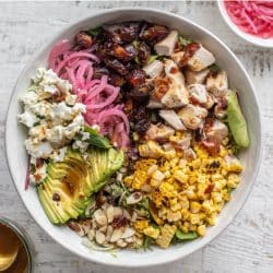 This rotisserie chicken salad may be my favorite greens salad ever! Loaded with flavor and crunch and drizzled with hot bacon dressing, it’s a serious dream. Super satisfying and lots of sweet & savory in this bowl!