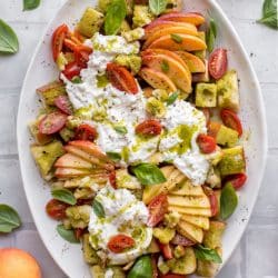 This peach panzanella is a summer dream! Toasty bread cubes drizzled with basil vinaigrette and served with perfect burrata cheese. Delish!