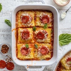 This is such a fantastic comforting dish and so much easier than it looks. It’s also a perfect dish that can be assembled ahead of time and baked later – OR even reheated. It reheats so well. Both of those are sticking points when it comes to weeknight meals for us: I love to be able to prep something early in the day or the night before, or easily reheat leftovers for lunch. And this is it!