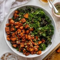 This smoky sweet potato kale salad is drizzled with a warm ginger dressing and topped with roasted pepitas. It’s a lovely weekenight meal or perfect make ahead lunch – and so easy and flavorful!