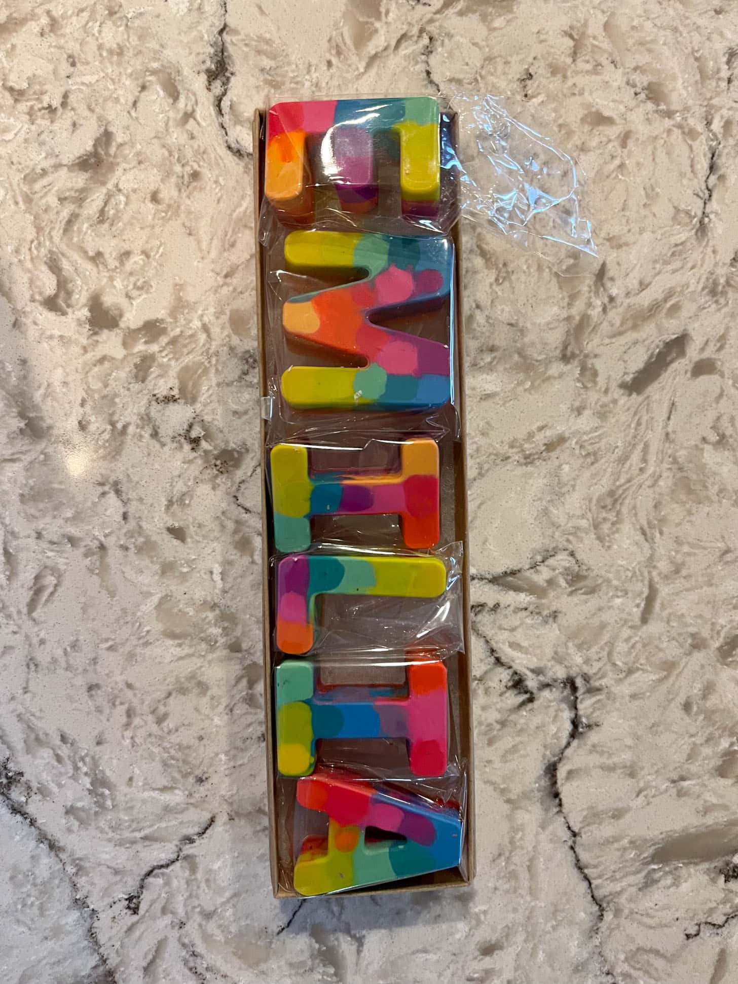 How cute are these name crayons? I got these for treat bags for the kids birthdays. I also got fun halloween ones for the kids’ treat bags. I bouught them on etsy but now the shop is showing as no longer available. If you search on etsy for colorful name crayons, you can find similar ones.