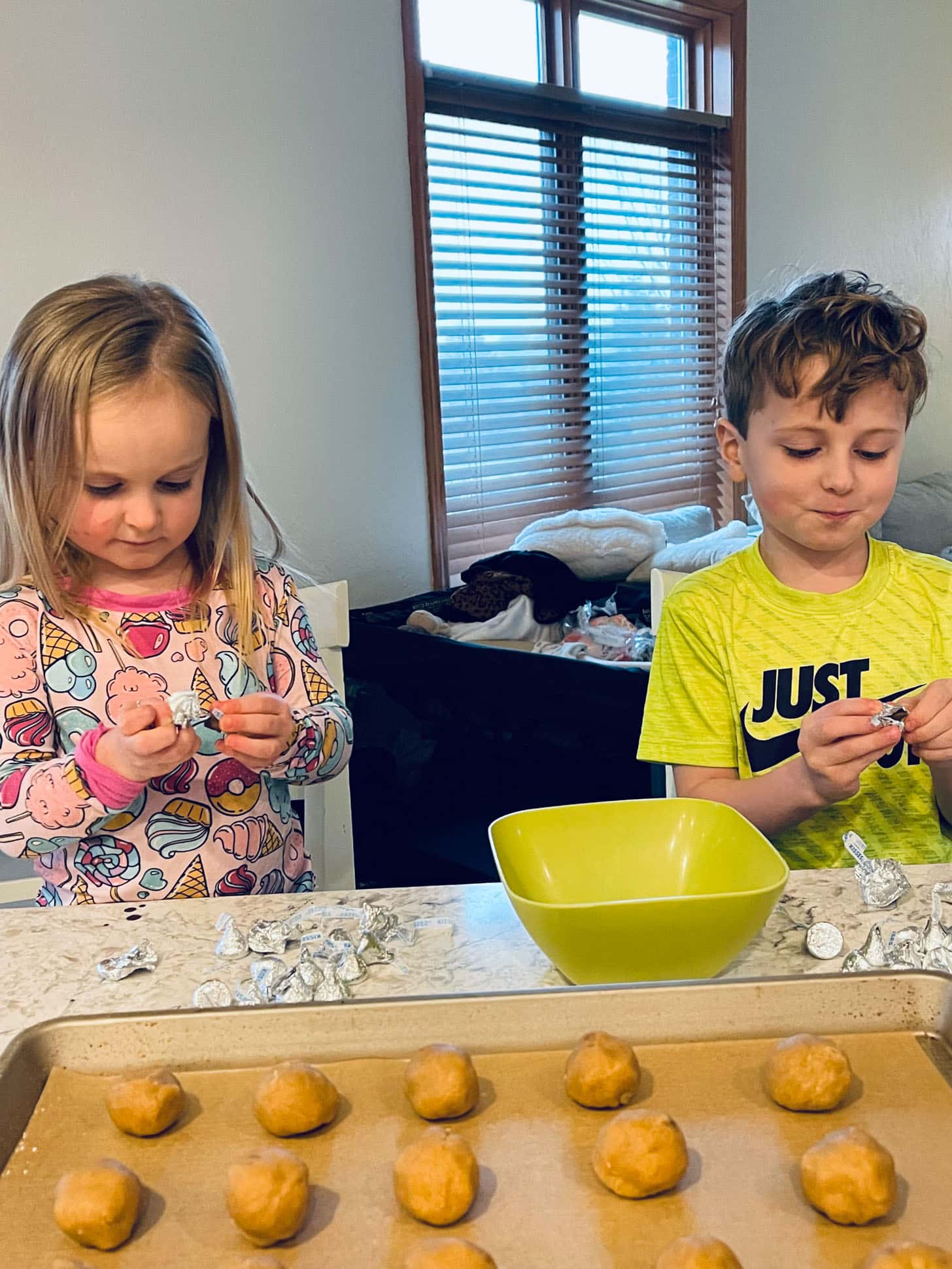 These two partners in crime opened all the kisses for the peanut butter blossoms.