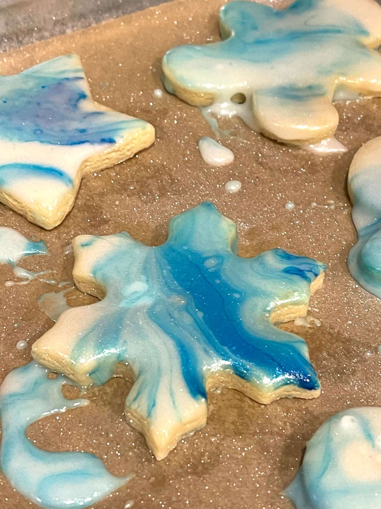 I also like to do a few of these marble icing ones. I use this recipe. Then I use this wilton edible shimmer spray!
