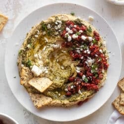 This fancy hummus is the perfect way to spruce up a store bought tub of hummus for guests or a dinner party. When you need a delicious appetizer in a pinch, this can be the go-to!