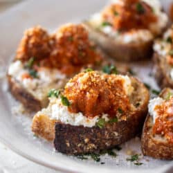 • Once the meatballs are done and bread is toasted, slather the bread with a few spoonfuls of ricotta cheese. Top with a meatball or 2 or 3! Sprinkle with fresh herbs and breadcrumbs if you wish! Serve immediately.