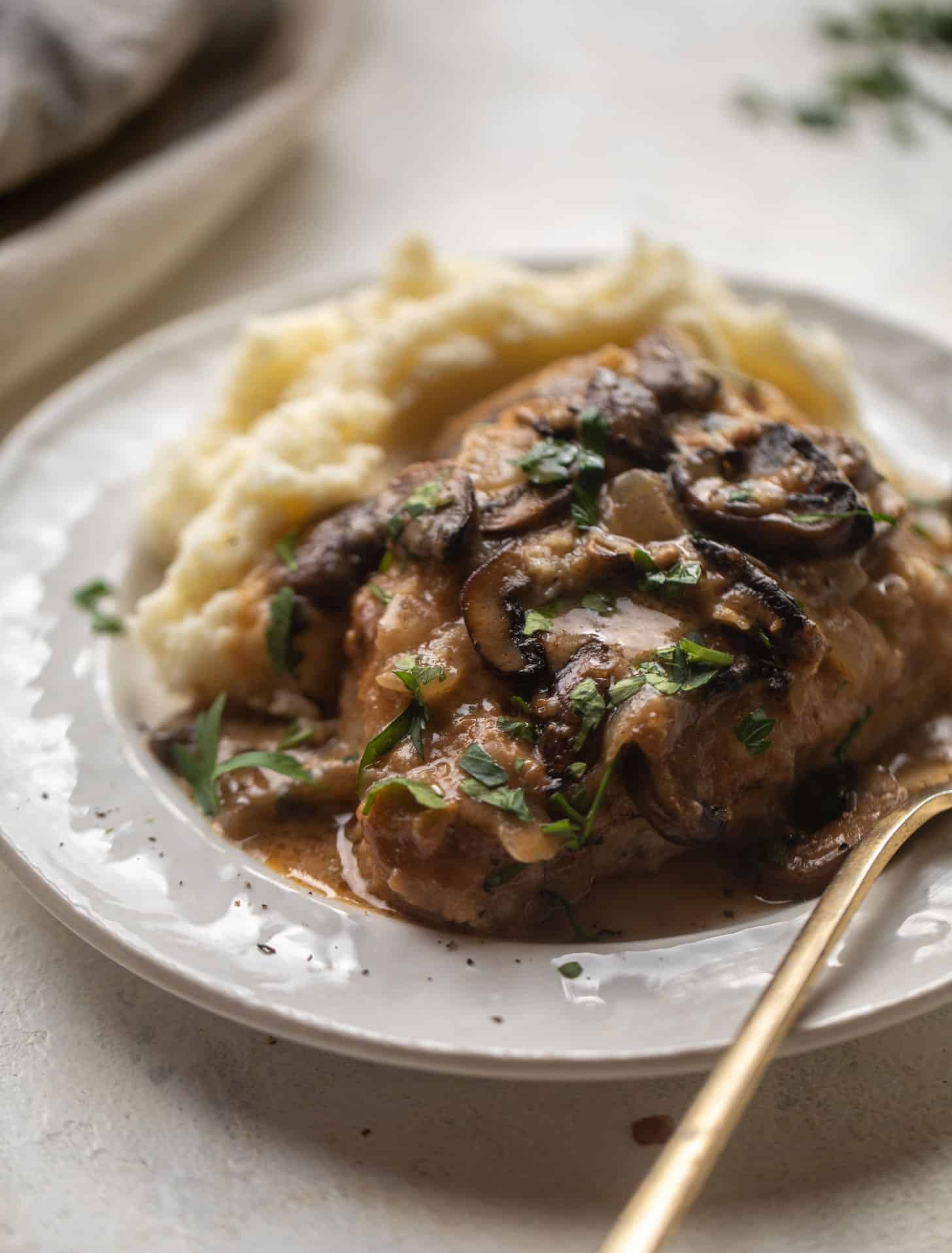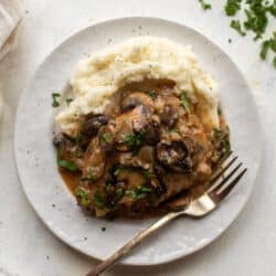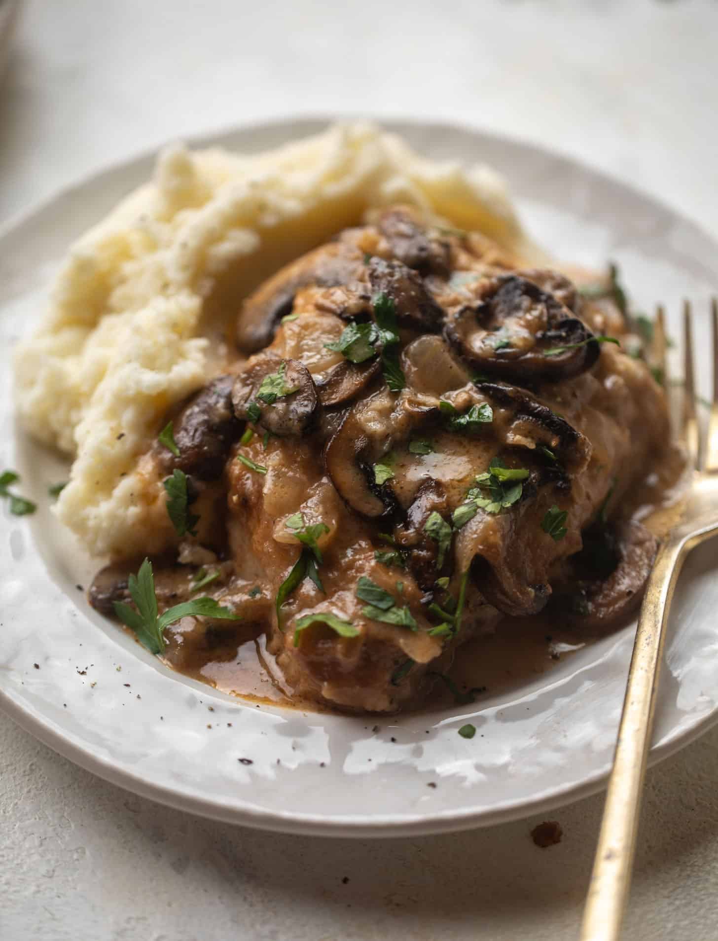This smoky pork chop marsala is tender and so flavorful, served over mashed potatoes with the most delish sauce. It’s such a perfect weeknight meal that the entire family loves – one that will warm you through and through. I mean, just look at this!