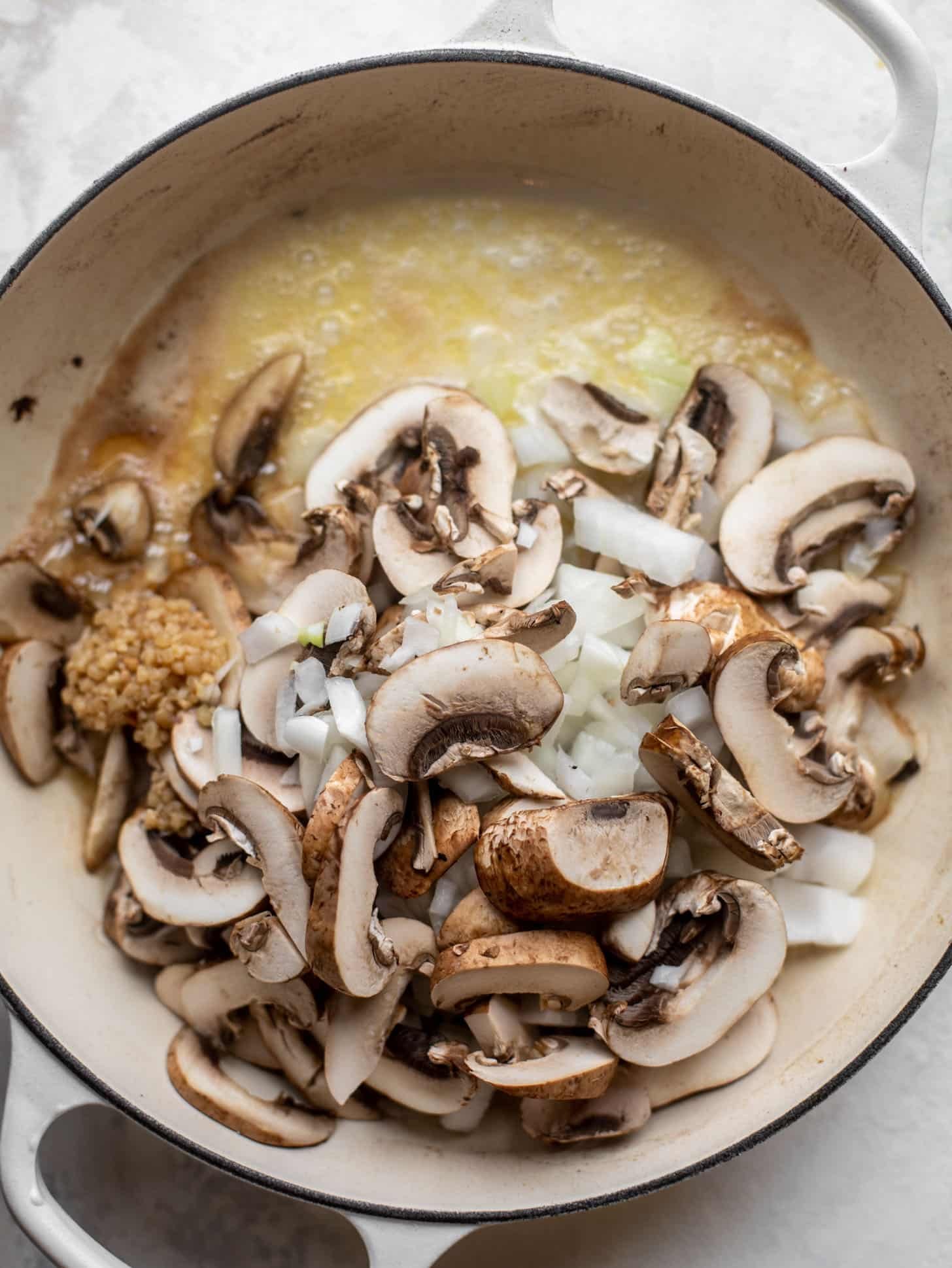 • After browning the pork chops, sauté the veggies. It gets up all the flavor bits! I start with butter, onions, mushrooms and garlic. Those classic building blocks of flavor add in SO much!