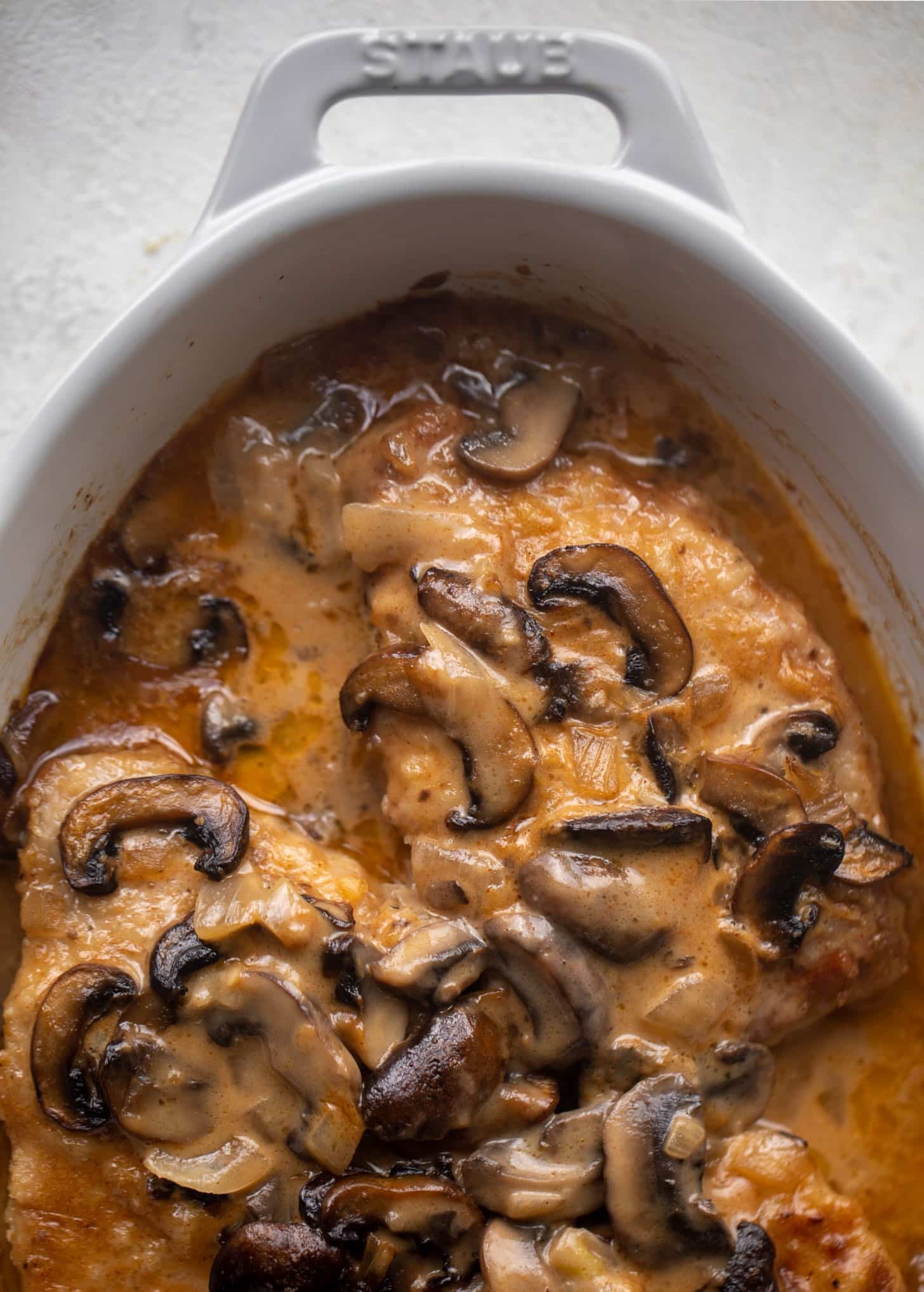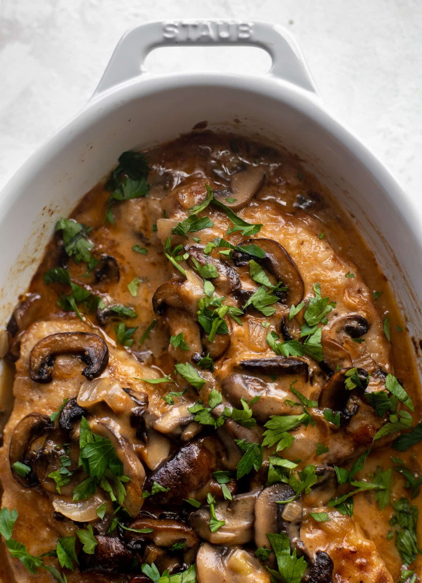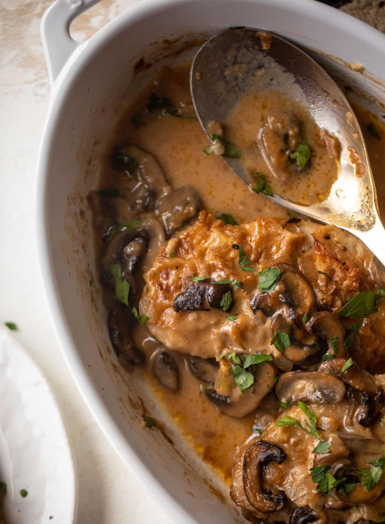 • Dry marsala wine and a drop of cream are the best for your sauce. I bake the entire thing in the oven for a few minutes to get it all saucy and fabulous. The pork chops are so tender!