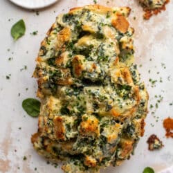 This post is sponsored by ALDI! This spinach artichoke bread is incredible! A loaf of buttery bread sliced and stuffed with melty, cheese spinach artichoke dip and then baked to perfect. It’s a dreamy snack or appetizer that everyone loves!