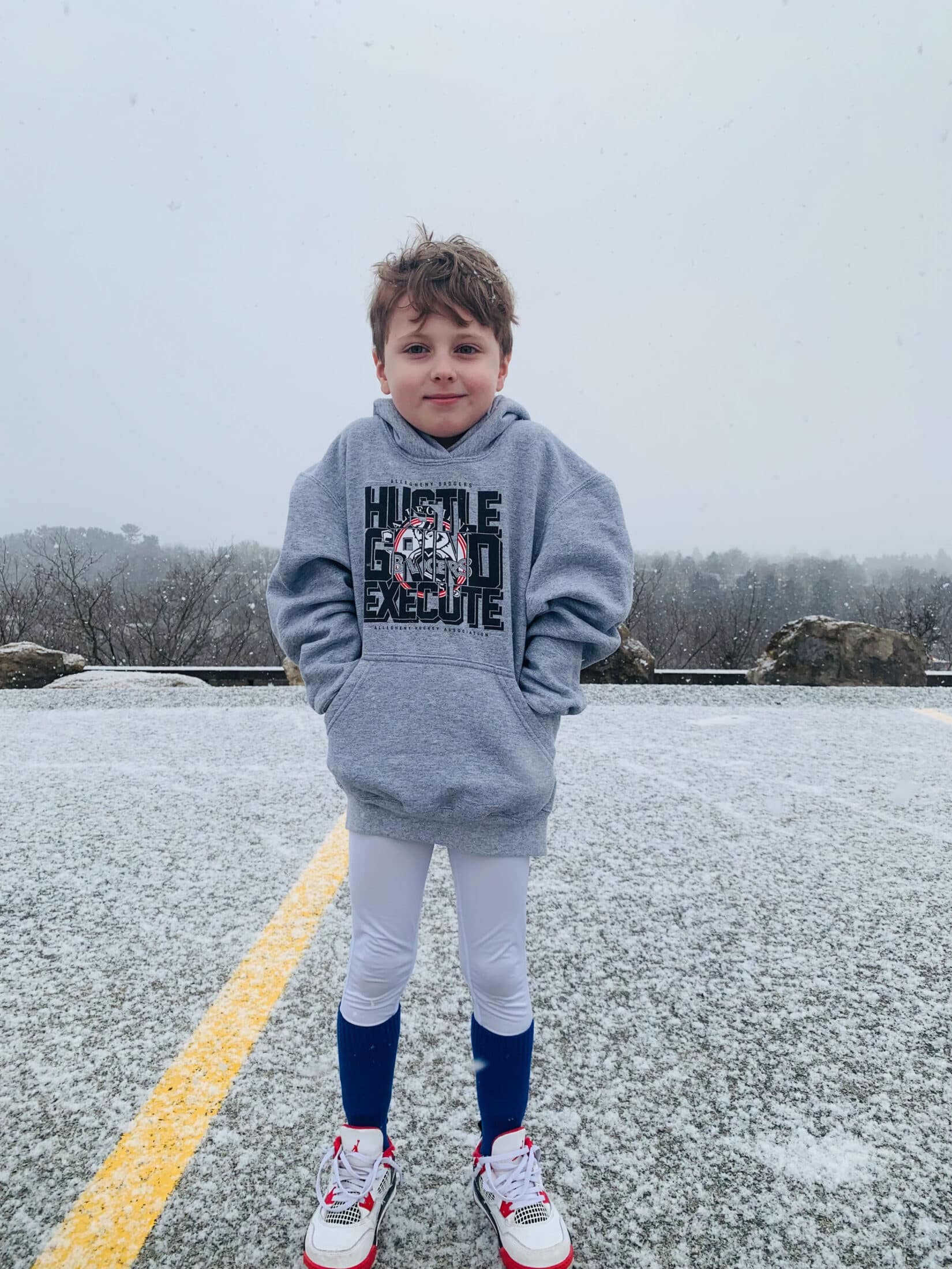 Surprise snow at hockey practice.
