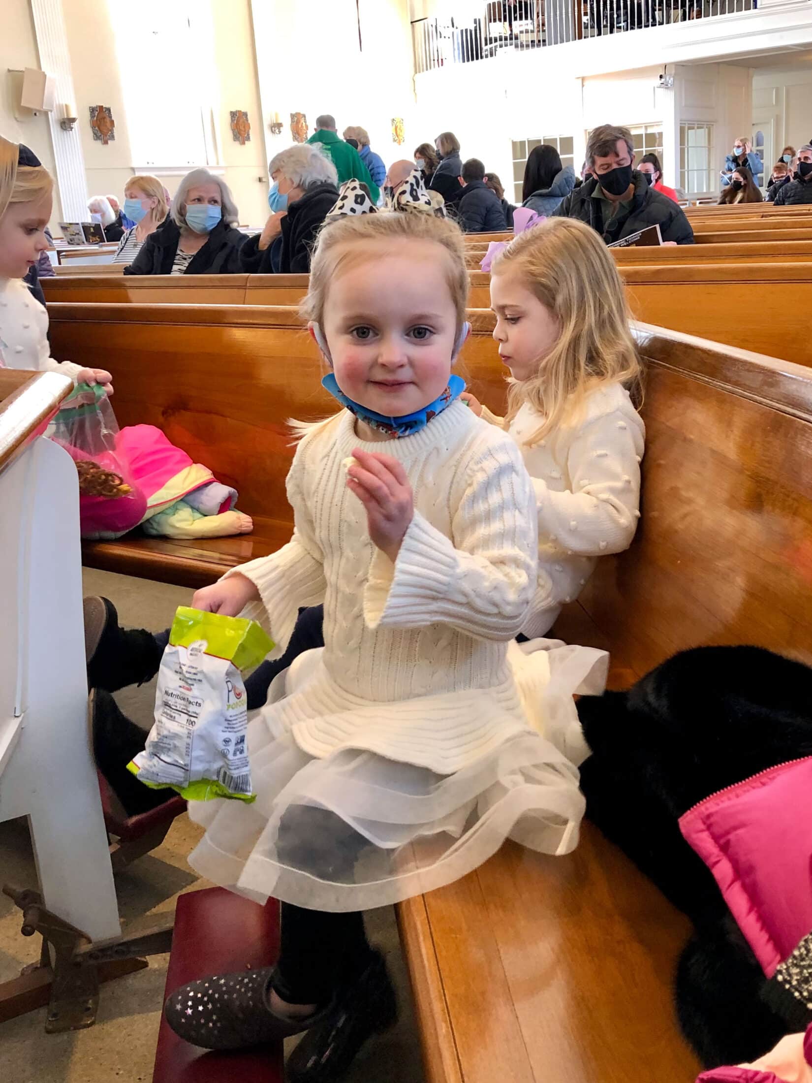 Snacks before church because these covid babies haven’t sat through a mass yet with life the last two years. Eight kids ages four and under in one pew!!!