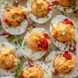 These deviled eggs are made with a classic-ish filling and one secret ingredient: pimento cheese! Plus topped with some crushed potato chips for the best flavor ever.