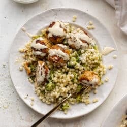 Cue all the exclamation points because these chicken meatballs are juicy and flavorful! They’re served with couscous loaded with broccoli and everything is drizzled in a bit of my homemade ranch. I can’t get enough of this meal. Wish I was eating it right this moment!