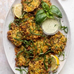 We love these zucchini corn fritters! Crispy, crunchy fritters filled with fresh zucchini and crisp summer corn, fried until golden and perfect. Serve with a lemon basil aioli for dipping. Heaven!