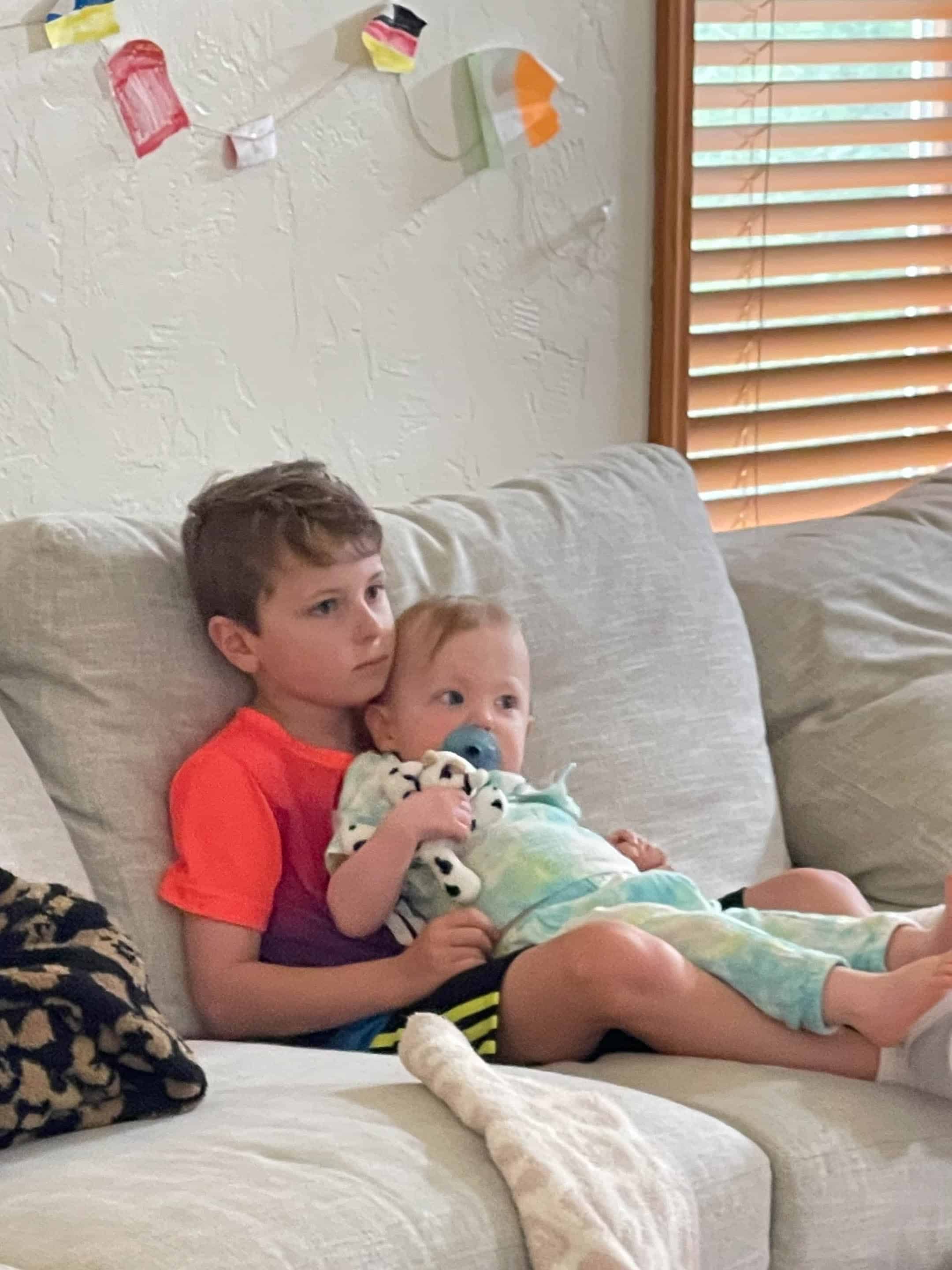 Post nap snuggles. I can’t even handle it! Also, please note the “flag banner” Max made of all sorts of flags and taped (!!!) them to the wall after stringing them on kitchen twine. Honestly there are pictures the kids colored taped all over the house. Anyone else?!