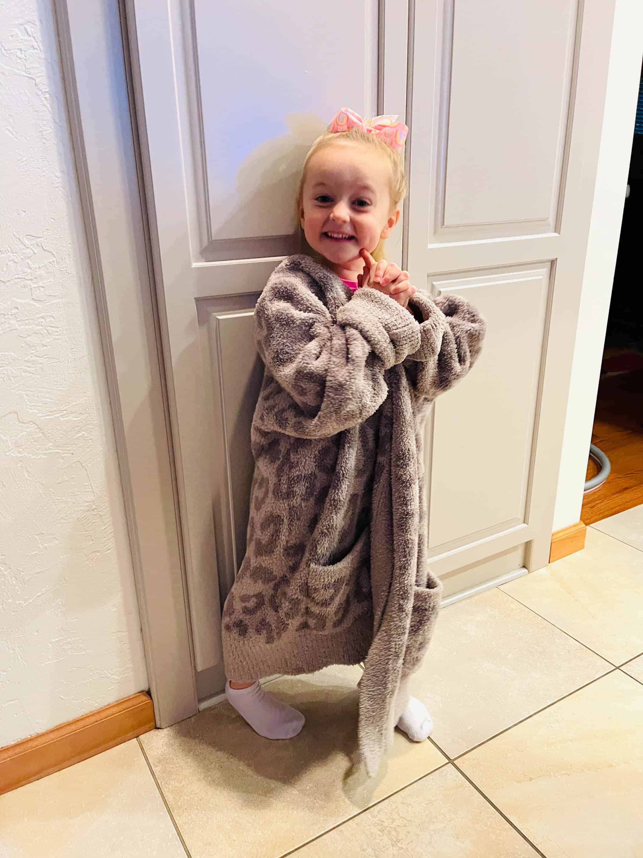 She reeeeeally wanted to wear my barefoot dreams cardigan. Ha.