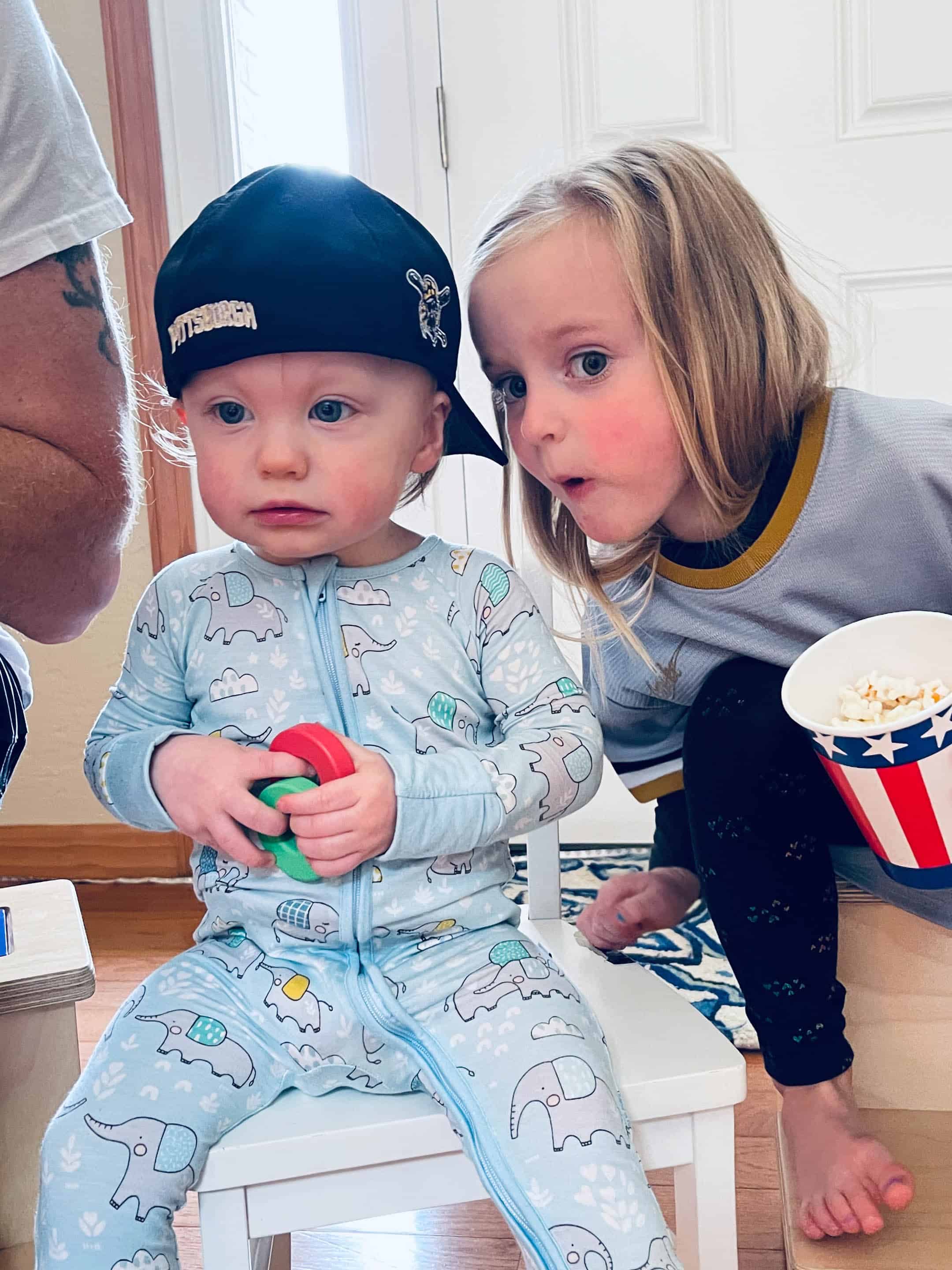 This morning Emilia set up a “movie theater” in the foyer. She even put popcorn in that paper cup.