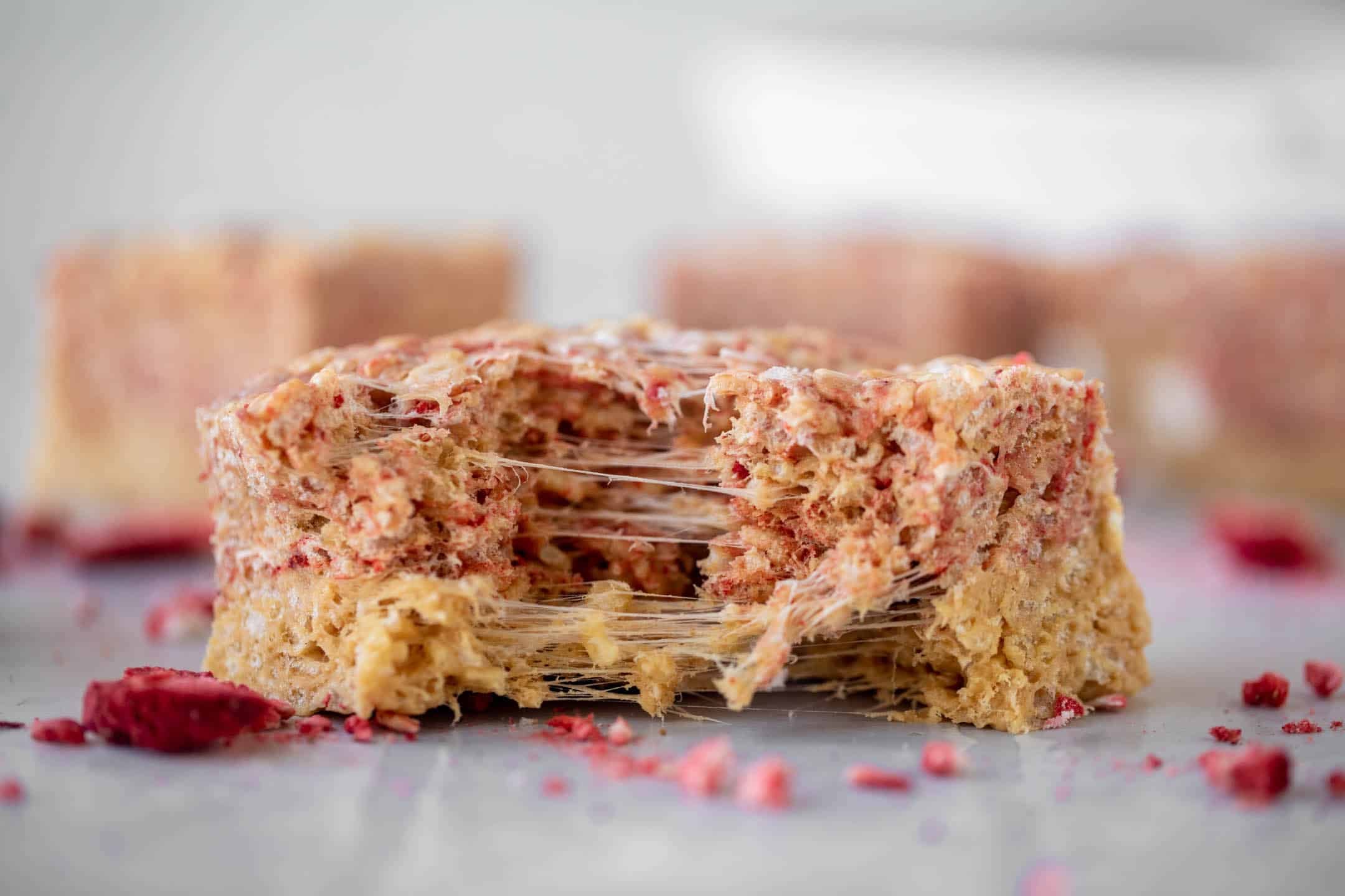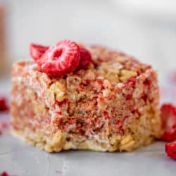 Making them is super simple. I use my peanut butter rice krispy treats recipe, stir the crushed freeze dried strawberries into half of the mixture, then layer them. As you press them into a dish, the strawberry flavor does mesh into most of the peanut butter, but in some of the photos you can see how it’s layered.