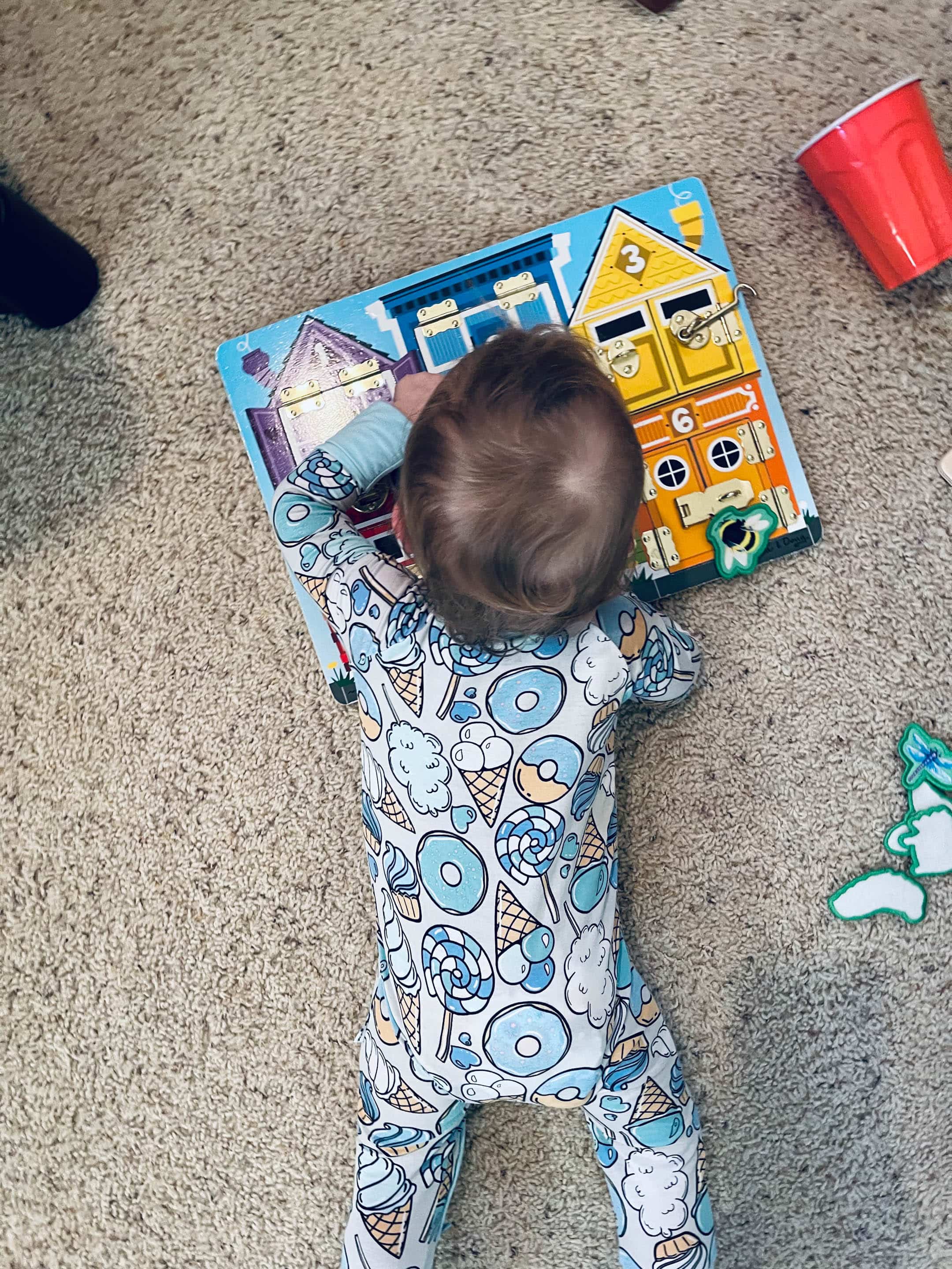 This cracked me up! Jordan on his belly playing with his busy board.